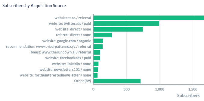 I’ve spent $2,724 on Twitter ads to acquire 987 subscribers at a $2.75 CPA (cost per subscriber).