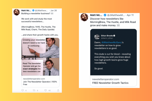 I had many one-off Tweets that drove 50-100 subscribers. But if I didn’t “plug” my newsletter below that Twitter with another Tweet (example), I would have seen far less newsletter growth.