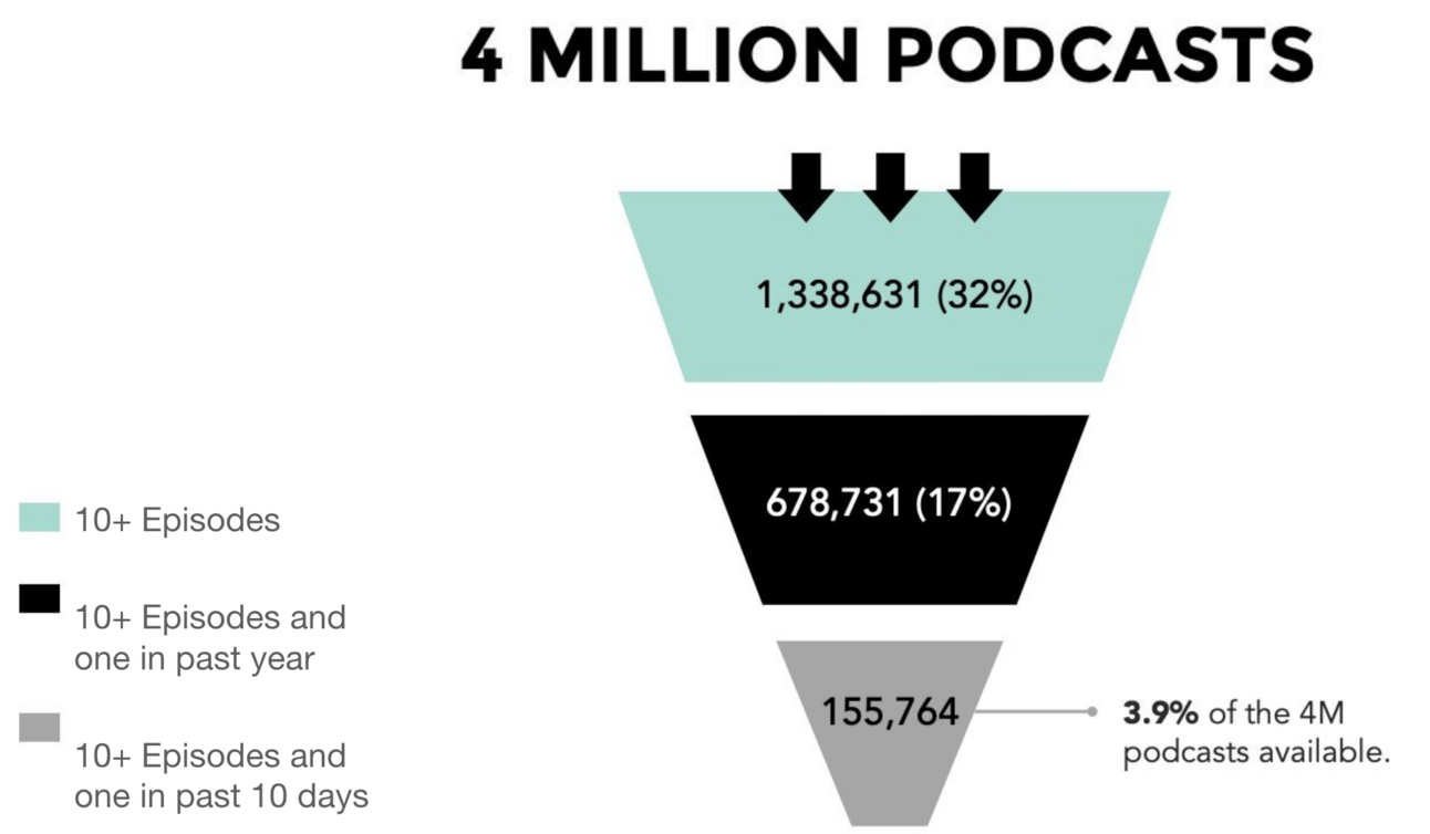 Only 3.9% of podcasts have 10+ episodes and have published 1 episode in the past 10 days. We don’t have the same data for newsletters but I expect the numbers would look strikingly similar.