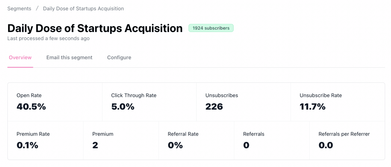 So to prepare for that future I ran an experiment to see if acquiring a newsletter in my niche (startups) and rolling their subscribers into mine was a valid growth strategy, or if too many would churn out — meaning that I’d need to plan to keep any newsletters I acquire going on their own.