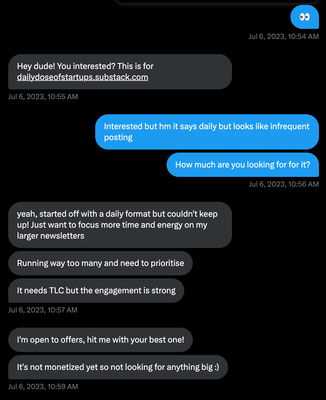 I found a post on X/Twitter from someone reputable who was looking to offload a small newsletter in my niche.