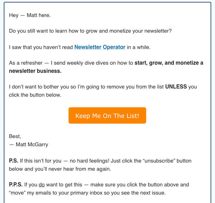 A win-back sequence should take you ~15 minutes to set up. Write 1-2 simple emails, set them up in your ESP, and you’re good to go.