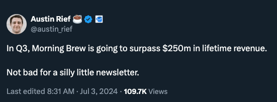 In Q3 2024, Morning Brew is on track to surpass $250m in lifetime revenue.