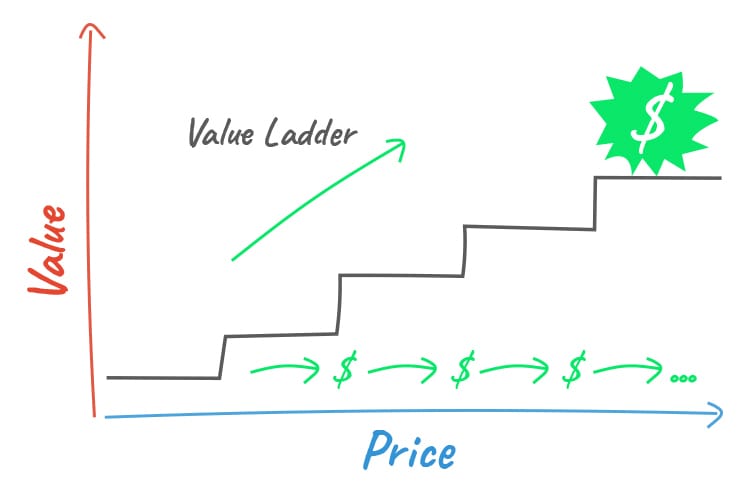 On each step of the value ladder is one of your offers — and those offers increase in value and cost as customers go up from left to right.