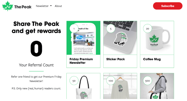 Through referring subscribers to The Peak, readers could earn stickers, merch, and even a MacBook Pro.