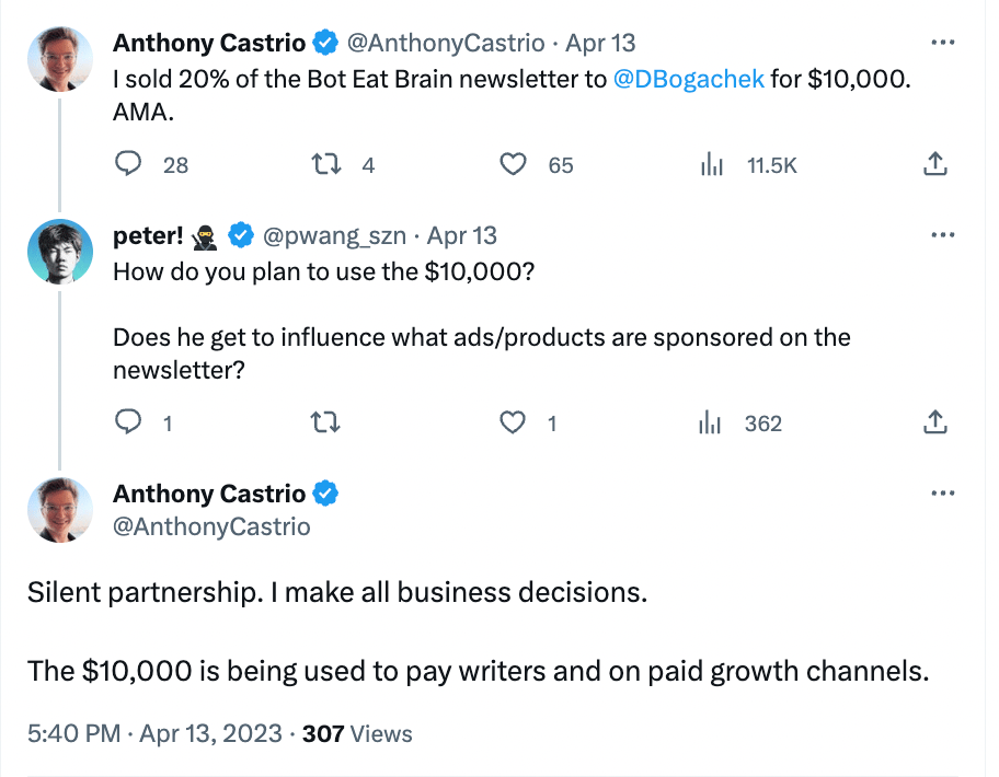 As a solution to this problem, he sold 20% of his newsletter for $10,000 in Apr’23.