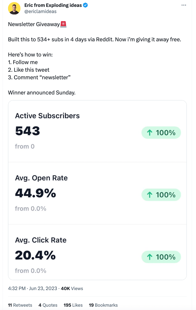 Eric Lam built an AI newsletter with 534 subscribers just in 4 days and gave it away for free on Twitter.